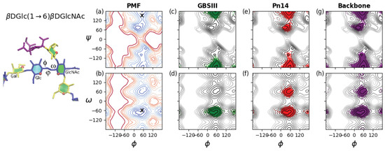 Figure 5 provides a comparison of the flexibility of the three-bond glycosidic linkage in a dGlcp(1→6)dGlcpNAc disaccharide and the GBSIII PS, Pn14 PS and unbranched backbone PS. The three dihedral angles describing rotation about the three bonds in the (1→6) glycosidic linkage are here defined as = –––, = ––– and = –––. These dihedrals are labeled on the GBSIII fragment in Figure 5, left. A PMF energy surface for the (1→6) glycosidic linkage has, therefore, three dimensions. However, for ease of visualization and comprehension, we show only 2D projections of the 3D volume: the , PMF (Figure 5a) and the , PMF surface (Figure 5b) for a dGlc(1→6)dGlcNAc disaccharide in the gas phase. These PMF surfaces illustrate the range of motion possible for an unrestrained linkage. The , PMF in Figure 5a reveals that the central bond in the linkage described by the dihedral is relatively flexible, with multiple minima within the 2 kcal·mol contours: a global minimum conformation at = 71, a secondary minimum conformation at = −179 and a tertiary minimum in the = −60 region. In contrast, rotation about the dihedral is much more constrained, with a broad global minimum around 0 < < 75 and a narrow secondary well at = 160. The , PMF surface in Figure 5b confirms these minima for and shows the expected three minima for the dihedral, which are by convention termed ( ≈ −60), ( ≈ 60) and ≈ 180). Glucopyranosides are expected to be primarily in the conformation, with the :: population ratios approximately 6:4:0 [43].