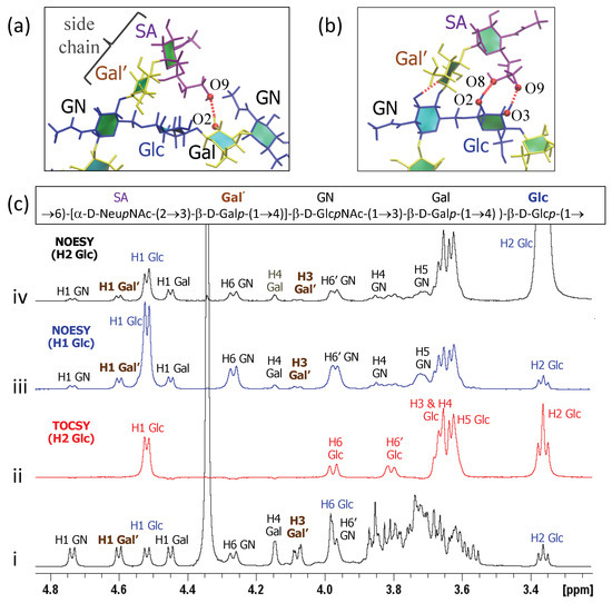 Inter-residue contacts in GBSIII PS. (a) Example of SA O9–Gal O2 hydrogen bond between the side chain and the backbone residues. (b) Example of simultaneous SA O9–Glc O3 and SA O8–Glc O2 hydrogen bonds. (c) Overlay of 1D NMR experiments of GBSIII PS showing (i) 1D proton spectrum; (ii) 1D TOCSY (200 ms) with irradiation of H2 Glc; (iii) 1D NOESY (500 ms) with irradiation of H1 Glc; and (iv) 1D NOESY (500 ms) with irradiation of H2 Glc.