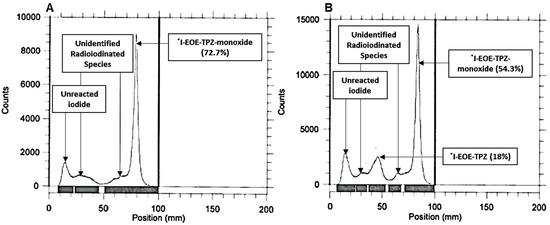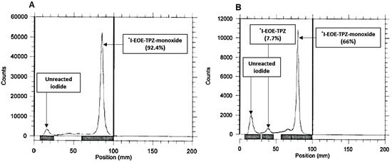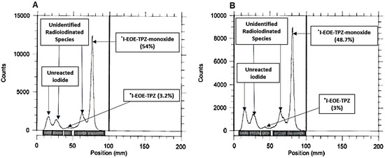 RTLC of the reaction mixture following [131I]iodide exchange on P2 at 22 °C. [131I]I-EOE-TPZMO is the main product by 30 min (A), [131I]I-EOE-TPZ is evident in low radiochemical yield (18%) at 60 min (B).