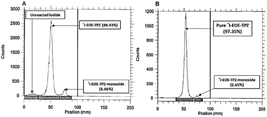 Nucleophilic reactions on P1, irrespective of reaction duration, in either DMF or ACN at 22 °C and at 60 °C demonstrated no formation of either [131I]I-EOE-TPZ or [131I]I-EOE-TPZMO, with only unreacted [131I]iodide detected by RTLC (Table 1). However, reaction for 60 min at higher temperatures (80 °C and 100 °C) in ACN afforded both products. Using DMF as a solvent at these (higher) temperatures also led to the formation of *I-EOE-TPZ, albeit in lower yields. Radioiodination at 80 °C for 60 min in ACN appeared to be the best condition for synthesizing [131I]I-EOE-TPZ (RCY 48.5%; entry 3 Table 1) via nucleophilic substitution of precursor P1; at 100 °C, this reaction favored production of [131I]I-EOE-TPZMO (RCY 50.2%; entry 4 Table 1). Reaction conditions and product yields are given in Table 1 and typical radiochromatograms for 80 and 100 °C are shown in Figure 2 (A and B).