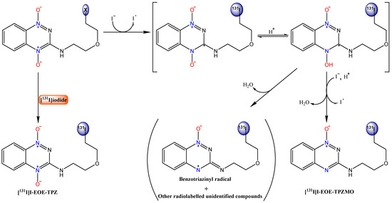 [131I]I-EOE-TPZ and [131I]I-EOE-TPZMO, the desired products, were both identified in reaction mixtures following nucleophilic substitution of the tosylate precursor (P1) by [131I]iodide, and upon halogen isotope exchange between [131I]iodide and non-radioactive precursor I-EOE-TPZ (P2). Radiochemical yields were strongly dependent upon reaction conditions.