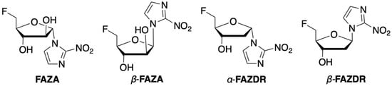 FAZA [23,24], α-FAZDR and β-FAZDR [13] were prepared by known procedures; for β-FAZA, a novel synthesis route was developed, although β-FAZA is a known compound [14]. Figure 1 gives the structures of the non-radioactive fluorinated 2-nitroimidazole sugars that were synthesized and evaluated for their interaction with human nucleoside transporters (see Section 2.3).