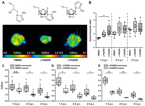 Exemplary structures and PET images of [18F]FMISO, α-[18F]FAZDR and β-[18F]FAZDR in carcinoma tissue 1 h p.i. (A), calculated tumor-to-muscle ratios (TMR) are shown in B. β-[18F]FAZDR (n = 4) displayed significantly higher TMR in comparison to [18F]FMISO (n = 5) 1 h p.i. (B), while α-[18F]FAZDR-TMR (n = 4) were not significantly different at any time-point. [18F]FMISO displayed significantly higher uptake in carcinomas vs. muscles only at 2 h and 3 h p.i. (C), while α-[18F]FAZDR and β-[18F]FAZDR at all measured time-points (1 h, 2 h and 3 h p.i.). * p < 0.05, ** p < 0.01 (D,E).
