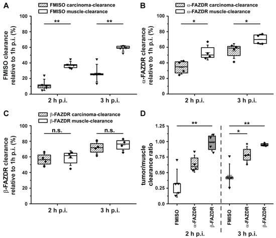 [18F]FMISO clearance was significantly different from carcinoma and muscle tissue (n = 5, A), however lower in comparison to clearance rates from both tissues for α-[18F]FAZDR (n = 4, B) and β-[18F]FAZDR (n = 4, C). Tumor/muscle-clearance ratios were significantly lower for [18F]FMISO in comparison to β-[18F]FAZDR at 2 h p.i. and to both, α-[18F]FAZDR and β-[18F]FAZDR at 3 h p.i. * p < 0.05, ** p < 0.01 (D).