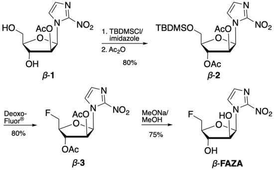An improved synthesis of the β-arabinose-derived nucleoside analog β-FAZA from the known starting material β-1 (prepared as described by Kumar et al. [25]) was developed (Scheme 1). Selective silylation of the primary hydroxyl group at C-5′ with TBDMSCl/imidazole in pyridine, followed by acetylation, furnished crystalline and fully protected nucleoside β-2 (80%). Bis(2-methoxyethyl)aminosulfur trifluoride [26] (Deoxo-Fluor®) converted it to 5′-fluoro nucleoside β-3 in 80% yield. Deprotection with MeONa in MeOH gave the desired arabinose-derived nucleoside β-FAZA in 75%. β-FAZA was recently prepared by a different approach [14]. Here, we were able to improve the overall process compared to [14] by a reduction of synthetic steps (for initial reaction steps from the commercially available 1-β-D-(ribofuranosyl)-2-nitroimidazole, see [14,25]), overall reaction times, and an increase in yield to 48% for the three steps shown in Scheme 1, compared to 21% for the last three steps in [14]. The improvement was obviously due to the utilization of the commercial fluorination agent, Deoxo-Fluor®, in the penultimate step.