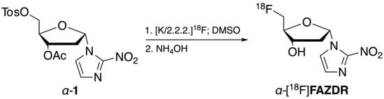 FAZA [23,24], the precursor [13] for radiosynthesis of α-[18F]FAZDR (1-(3′-O-acetyl-2′-deoxy-5′-O-p-toluenesulfonyl-α-D-ribofuranosyl)-2-nitroimidazole (α-1)), α-FAZDR and β-FAZDR [13] were prepared by known procedures. All other chemicals and solvents (either Fluka or Merck) were of the highest purity available and used as received. Deuterated solvents were ordered from Eurisotop GmbH (Saarbrücken, Germany).