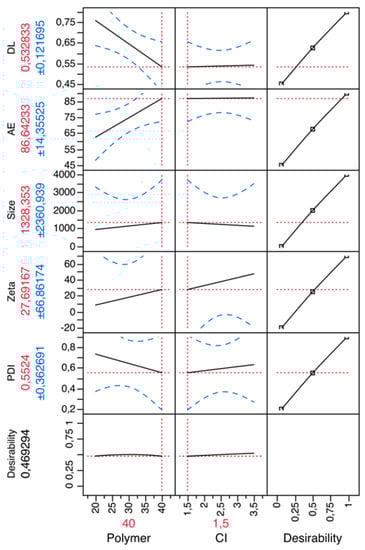 Prediction profiler for chitosan (CH) microparticles (MPs). X-axis: polymer (CH) (mg), counter-ion (TPP) (mg); Y-axis: polydispersity index (PDI), zeta potential (mV), size (nm), association efficiency (AE), drug loading (DL).