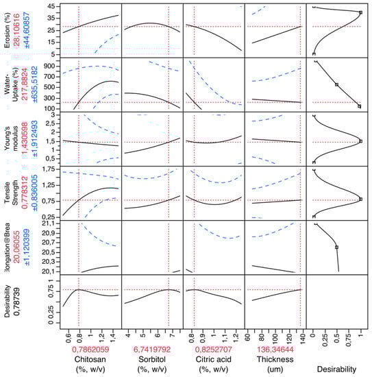 Firstly, a CH film experimental design was performed in order to obtain optimized formulations and understand how excipients influence the mechanical characteristics of the films. Figure 2 shows the prediction profilers used in the optimization of the formulations of CH films.