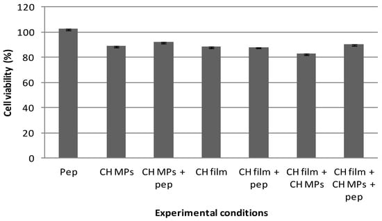 Cell viability under effect of peptide (5 μg/mL); CH MPs, CH film and CH MPs incorporated into CH film with and without peptide (5 μg/mL), measured by MTT assay and expressed as the mean ± SD (n = 5).