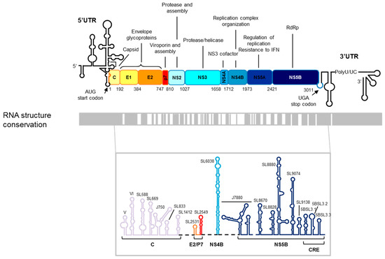 The hepatitis C virus (HCV) RNA genome. Upper panel: A schematic representation of the genetic organization of the viral genome. The 5′ and 3′ UTRs flanking the single ORF are depicted by a black line. The viral proteins and their functions are indicated. The translational start and stop codons are marked by arrows. The numbering corresponds to the codon positions in the ORF according to the HCV Con1 isolate, genotype 1b. Lower panel: A structural conservation map of the HCV RNA is represented by gray boxes denoting structurally conserved regions among different viral isolates. The predicted secondary structures of conserved elements in the ORF of the viral RNA genome are shown at the bottom. The color code and labels at the bottom indicate the position where each stem-loop is located. The figure is adapted from Reference [27].