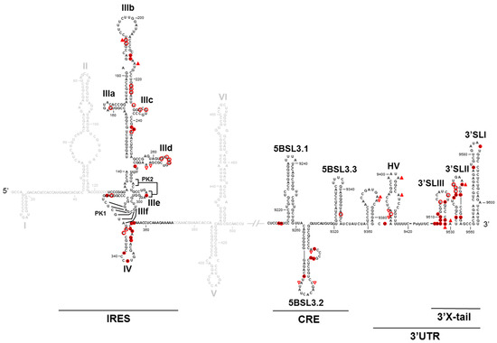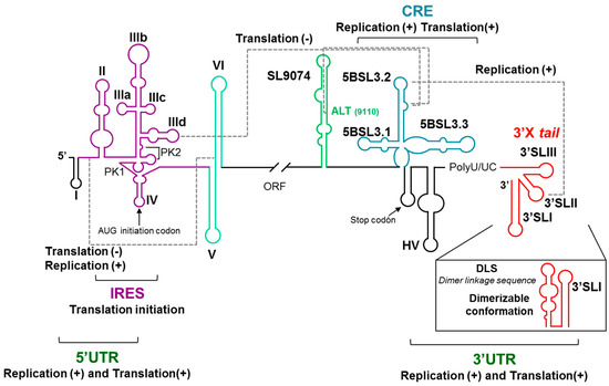 All together, these results probe the existence of a network of long-range RNA–RNA interactions. This network involves essential structural genomic RNA domains of at least the IRES, CRE, and the genomic 3′ UTR X-tail region and governs the regulation of the essential viral processes (reviewed in References [27,43]; Figure 2), in which the CRE 5BSL3.2 domain seems to be the conductor of the orchestra directing the regulatory interactions of all other structural elements.