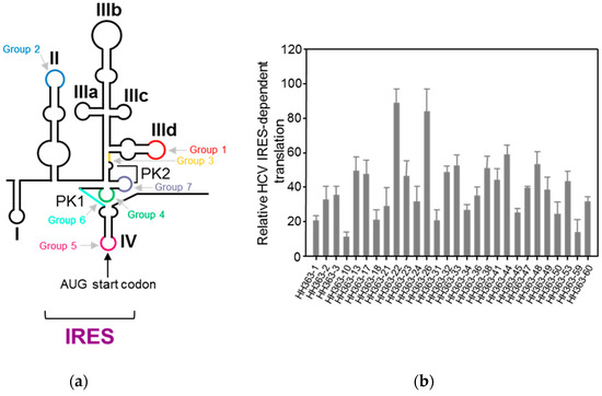 The selection of RNA inhibitors targeting the HCV internal ribosome entry site (IRES): (a) The identification of the aptamer targets within the IRES. The targets determined by the complementary sequence to the consensus motif that define each aptamer’s group are indicated using a colour code on the schematic representation of the secondary structure of the IRES. (b) The inhibition of the IRES activity by a collection of selected aptamers: The IRES-dependent translation was measured in vitro as the Fluc activity. The values are the mean of at least three independent experiments and are referred to the activity in the absence of an RNA inhibitor. Figure adapted from [61].