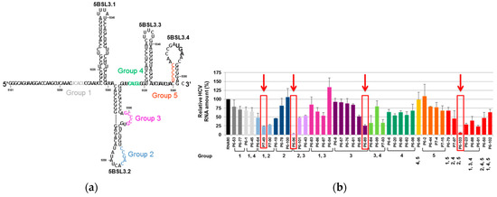For this assay, a starting population of RNA molecules resulting from the randomization of 30 contiguous nucleotides (yielding a theoretical heterogeneity of more than 1 × 1018 variants) was synthesized and introduced in a standard SELEX procedure. With this strategy, we searched for binders to a 194-nt-long viral genomic RNA fragment containing the CRE structural element [66] (Figure 6a). After nine rounds of selection, a collection of RNA aptamers could be classified in five different groups defined by a consensus sequence, which was complementary to a specific domain within the viral target RNA (Figure 6a). These complementary sequence motifs are likely involved in the binding of the two molecules. Interestingly, the majority of the selected aptamers contained more than one consensus sequence and potentially more than one site of binding in the target molecule [66,67]. To test the potential of the CRE as anti-HCV target, a collection of 44 aptamers was assayed for their capacity to inhibit HCV replication. For this purpose, the sub-genomic viral replication system based on the Huh-7 cell lines mentioned above (see Figure 5) was used. The results of this analysis showed than a significant number of tested aptamers efficiently reduced the viral RNA levels (Figure 6b). It is worth noting that those aptamers that yield the highest inhibition levels contained the consensus sequences of groups 2 and 3, which target the apical and internal loops of the 5BSL3.2 domain, respectively (Figure 6). Further characterization of the inhibitory effect of aptamers P6-89, P6-96, and P6-103 competed out the recruitment of the viral polymerase by the 5BSL3.2 region [67]. This result was also confirmed with the group 2 aptamers P-58 and P-78 [68]. Further, the P7-49 that is also an efficient HCV replication inhibitor seems to bind to the 5BSL3.4 rather than 5BSL3.2 domain. Our data suggests for the 5BSL3.4, which bears the translational stop codon, to have new unknown roles in the viral cycle.