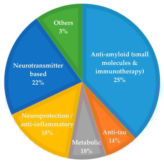 However, besides the mentioned difficulties in the development of new therapies for AD, there are currently large research programs for the drug development of new anti-AD agents. In 2018, there were 112 agents in the AD pipeline, of which 23 in phase I, 63 in phase II and 26 in phase III. Across all stages, 63% are DMTs, 34% symptomatic agents for neuropsychiatric and behavioral changes, and 3% have undisclosed mechanism of action (MoA) []