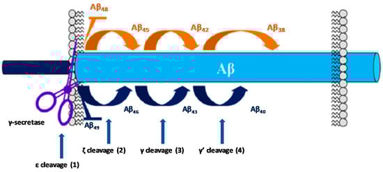 The activity of GS on the substrate APP occurs after the cleavage performed by β-secretase (BACE-1). Then, GS perform a series of cleavages within the transmembranar domain of the remaining fragment (C99), termed epsilon (ε), zeta (ζ), and gamma (γ) cleavages, allowing the generation of Aβ peptides of different lengths (Figure 5).