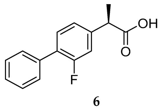 Though, and as expected, the use of NSAID as GSMs present some issues in terms of gastrointestinal and renal toxicity due to its activity against cyclooxygenase 1 (COX-1), compromising its use as a long-term therapeutic solution []. Fortunately, COX-1 inhibition activity was shown to be independent of γ-secretase modulation activity. For instance, flurbiprofen is a COX-1 inhibitor administered in the clinic as a racemate. However, the R-enantiomer, tarenflurbil (6) (Figure 8), showed reduced activity in terms of COX-1 inhibition while maintaining its action as a GSM [].