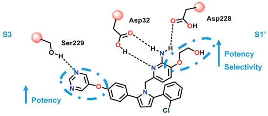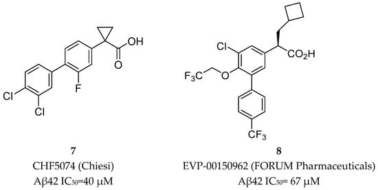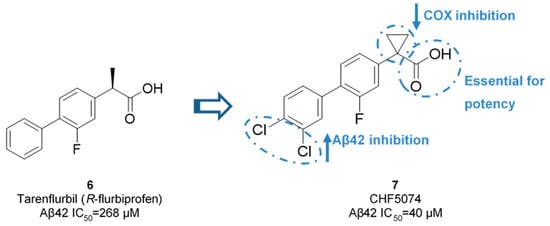 Chiesi Farmaceutici developed CHF5074 (7) based on the scaffold of tarenflurbil (6). The replacement of the R-methyl substituent by a cyclopropyl group led to a complete removal of COX inhibition (at 100 µM for COX-1 and 300 µM for COX-2). Aβ42 production inhibition were improved with the addition of chlorine substituents on the terminal phenyl ring, allowing a 7-fold comparing with tarenflurbil (6) [] (Figure 10). The carboxylic acid function was proposed to interact with a lysine residue of APP located close to the membrane interface, with the lipophilic substituents serving as membrane anchors [].