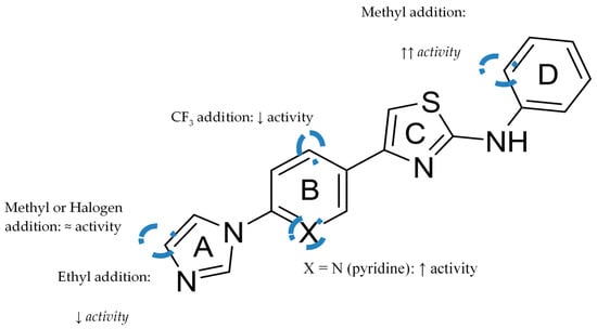 This class of compounds share a scaffold consisting of four consecutives linked (hetero)aromatic rings identified as A, B, C and D which focus on aryl- or heteroarylimidazoles with an anilinothiazole. Figure 12 represents the basic scaffold and the structure-activity relationship established. The addition of a methyl or a halogen at the 4-position of the imidazole ring does not have a significant impact on potency, while the addition of a CF3 substituent in ring B, ortho to the thiazole, leads to a decrease in activity. A pyridine or pyrimidine ring at B ring increases potency, as well as the addition of an ortho methyl substituent in the aniline [].