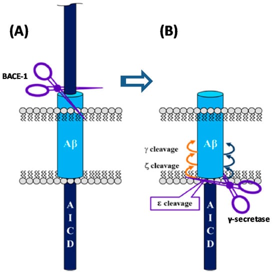 Processing steps of APP by (A) BACE-1 and (B) GS. Adapted with permission from []. Copyright 2016 American Chemical Society.