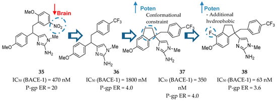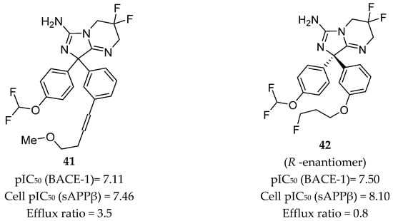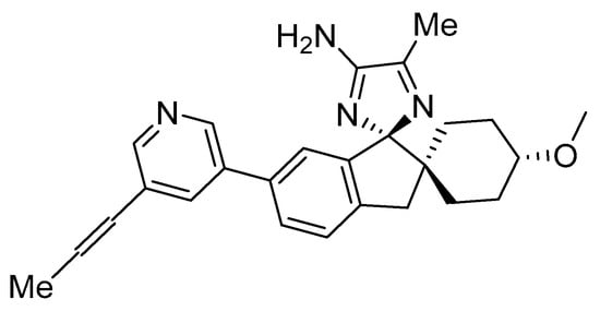E2212 (17) entered in a phase I clinical trial in 2010 (clinicaltrials.gov Identifier: NCT01221259). It demonstrated to have a similar pharmacological profile as E2012 (16) and a better safety profile, with no clinically significant ophthalmologic findings []. The PD response measured in plasma increased with the dose and was shown to perform 54% Aβ42 reduction at the 250 mg dose. No further development has been reported to date for E2212 (17) by Eisai and the platform clinicaltrials.gov does not present new studies. The predicted structure of E2212 (17), possessing four aromatic rings, a high molecular weight (480 g/mol) and a high cLogP (5.5) [] could have conditioned its further development due to its poor drug-like properties.