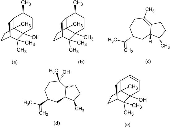 Molecular structure of the major compounds of P. cablin essential oil. (a) Patchouli alcohol (33.25%), (b) Seyshellene (6.12%), (c) α-bulnesene (4.11%), (d) Pogostol (6.33%), and (e) Norpatchoulenol (5.72%).
