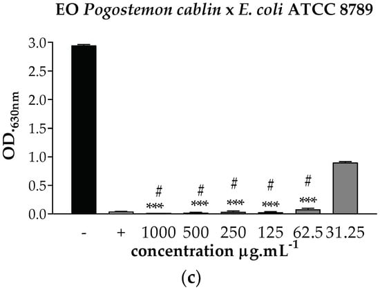 The MCB was determined based on the results obtained in the MIC test. Microplate wells were spread in Müller-Hinton agar and incubated at 37 °C for 24 h. The MBC was established as the lowest concentration of EO capable of completely inhibiting microbial growth in Petri dishes after 24–48 h of growth.