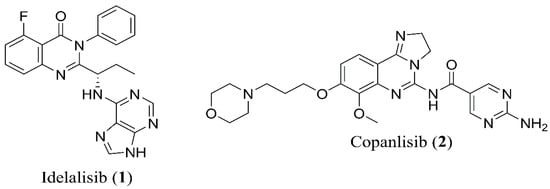 In 2014, Food and Drug Administration (FDA) approved the idelalisib (1), a first-in-class inhibitor of PI3Kδ, for the treatment of relapsed chronic lymphocytic leukaemia (CLL), relapsed follicular B-cell non-Hodgkin lymphoma (NHL) and relapsed small lymphocytic leukaemia (SLL) [1]. Although idelalisib (1) (Figure 1) possesses an enhanced selectivity for the PI3Kδ, it opened a new road ahead for the family of phosphoinositide 3-kinase (PI3K) inhibitors. In 2017, the approval of copanlisib (2) (Figure 1) for the treatment of relapsed follicular lymphoma (FL) and the ongoing trials on several hematological and solid malignancies has showed the usefulness of the pan-PI3K inhibitors in the clinics [2,3].