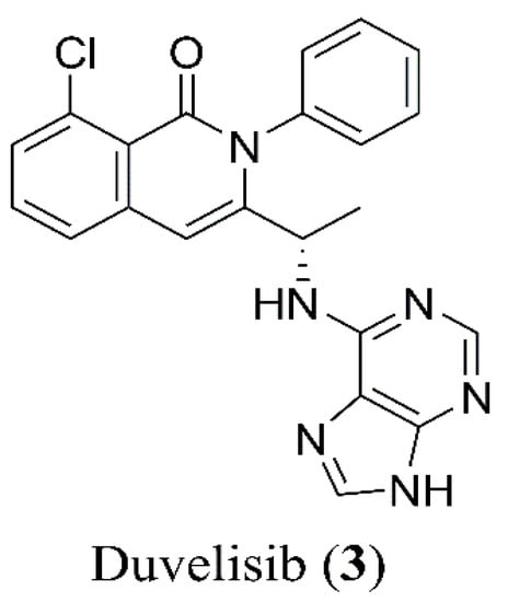 Duvelisib (3, Figure 2) is commercialized by Verastem Oncology, under the brand name Copiktra®. Its IUPAC name is: (S)-3-(1-((7H-purin-6-yl)amino)ethyl)-8-chloro-2-phenylisoquinolin-1(2H)-one, CAS 1201438-56-3.