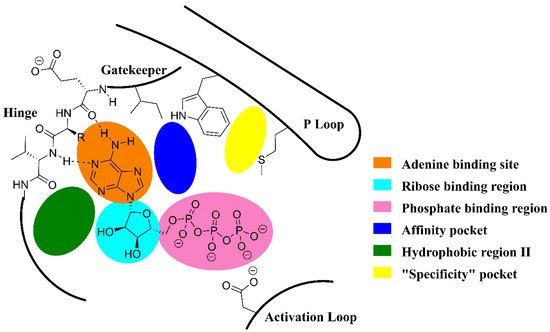 The duvelisib (3) binds at the ATP binding region, which is one of the most conserved throughout the PI3K family [8,16,17]. It is possible to explore the model generally used for the development of protein kinase inhibitors, incorporating features related to the inhibition of PI3K [18,19]. In general, PI3K inhibitors form hydrogen bond interactions in the region of the hinge, occupying the adenine binding site (Figure 4). The presence of the hydrophobic regions I and II in the active site of PI3K should be noted [20]. The former is also called the “affinity pocket” and it is commonly exploited by pan-PI3K inhibitors through a series of polar interactions. On the other hand, the hydrophobic region II is a region exposed to the solvent [20]. The compounds with the so-called propeller-shaped conformation open a hydrophobic pocket between the residues of tryptophan and methionine, also known as the “specificity pocket”, conferring selectivity for PI3Kδ [20] (Figure 4).