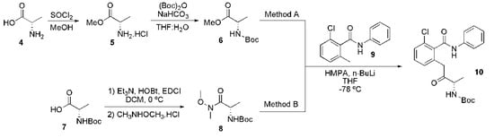 In method A, the (S)-2-aminopropanoic acid (4) reacted with thionyl chloride and anhydrous methanol to form (S)-methyl 2-aminopropanoate hydrochloride (5). The amine group on 5 was protected by its reaction with di-tert-butyl dicarbonate. The protected intermediate 6 was then coupled with the carbanion derived from 2-chloro-6-methyl-N-phenylbenzamide (9), giving the key intermediate 10. In method B, N,O-dimethylhydroxylamine hydrochloride was added to a mixture of (S)-2-(tert-butoxycarbonylamino)propanoic acid 7, triethylamine, HOBt, EDCI in dichloromethane for the preparation of (S)-tert-butyl-(methoxy(methyl)amino)-1-oxopropan-2-ylcarbamate (8), which, after reaction with the carbanion of 9, furnished the same key intermediate 10.