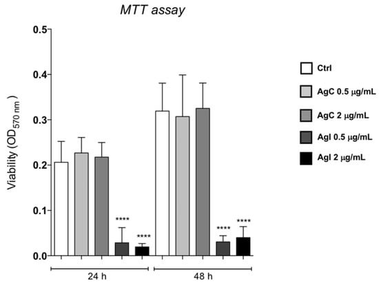 The effect of ionic and colloidal silver on cell viability was evaluated by measuring the reduction of 3-(4,5-dimethylthiazol-2) 2,5-diphenyltetrazolium bromide (MTT) to formazan by mitochondrial dehydrogenase [,]. Briefly, 9 × 103 cells were seeded on 96-well plates and exposed to increasing concentrations of either 0.5 or 2 μg/mL colloidal silver for 24 and 48 h. MTT/PBS solution (0.5 mg/mL) was then added to the wells and incubated for 3 h at 37 °C in a humidified atmosphere. The reaction was stopped by the removal of the supernatant, followed by dissolving the formazan product in acidic isopropanol. Optical density was measured with an ELISA reader (Bio-Rad) using a 570 nm filter using an iMark microplate reader (Bio-Rad, Hercules, CA, USA). Each experiment was performed in quadruplicate, in three independent experiments. The cell viability was calculated as CV (%) = (Absorbance of test sample/Absorbance of control) × 100.