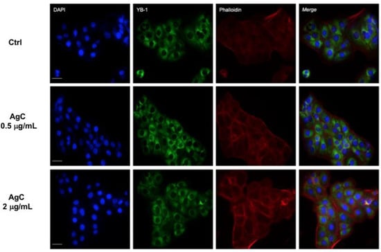 Effect of AgC on stress granules formation. HaCaT cells were seeded on a coverslip and treated (or not) with AgC at 0.5 or 2 μg/mL for 24 h. Cells were then fixed and analyzed by TRITC-conjugated phalloidin staining (red) or indirect IF with the anti-YB1 antibody (green). Nuclei were stained with DAPI. Scale bar, 7 μM. Images were acquired using a Nikon TE Eclipse 2000.