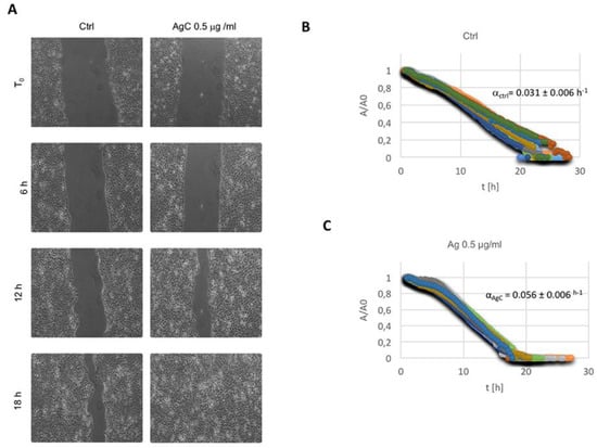 Images at the same time points show better closure of the wound for the treated sample with respect to the control. This result was systematic, as visible from Figure 3B,C, where the evolution of the wound area, normalized with respect to its initial value (A/A0), is reported for the control and treated sample, respectively. Raw data reported in the two diagrams for each independent field of view showed excellent reproducibility. We calculated the values of the wound closure velocity (α) from each data series, as reported in the Materials and Methods Section. Interestingly, the αAgC/αcontr (that is a measure of the relative effect of the treatment in our conditions) was 1.80, indicating that the wound closure velocity roughly doubled in the presence of AgC 0.5 μg/mL.
