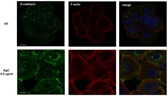 Regulation of cell shape and motility is governed in large by the cytoskeleton, of which actin filaments are the major components. Cytoskeletal elements influence the formation of cell–cell and cell–substrate adhesions that play a fundamental role in both cell morphology and migration which requires the continuous assembly and disassembly of cellular adhesions. To further characterize the effects of AgC on cell shape, the cytoskeleton and cell–cell contacts were examined by fluorescence microscopy by both phalloidin staining and E-cadherin immunofluorescence. Cells were allowed to adhere onto coverslips overnight, treated with 0.5 μg/mL AgC for 8 h, fixed, and subjected to IF with anti-E-cadherin, followed by TRITC-conjugated phalloidin incubation to visualize the actin cytoskeleton and DAPI to stain the nuclei. As previously observed, cells displayed a dense meshwork of actin filaments around the cell periphery. Interestingly, the experiment showed that AgC treatment caused significant recruitment of E-cadherin at cell–cell junctions, which were apparent within 8 h of treatment (Figure 5). Similar results were obtained when cells were incubated with AgC for 24 h.