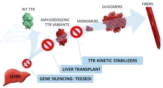 Strategies to prevent transthyretin (TTR) amyloidosis. Liver transplant is the standard practice since TTR (an amyloidogenic variant in familial amyloid polyneuropathy (FAP) patients) is mainly produced in the liver. Tegsedi inhibits hepatic production of TTR (both wild-type and amyloidogenic variants). TTR kinetic stabilizers are compounds that selectively bind to TTR, preventing its dissociation (Tafamidis was approved in E.U.).