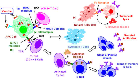 Illustration of immune response to cancer cells. (a) Vaccine constructs containing specific antigen(s) get internalized inside antigen-presenting cells (APCs) via endocytosis or binding with specific receptors. While inside APCs, immunogens get proteolyzed by immune proteasomes and divided into several peptide fragments containing antigen(s). If those fragments get loaded onto MHC I then they form MHC I complexes. The resulting complex is transported to the surface so that it can be recognized by CD8+ T-cells. Activated T-cells proliferate to give cytotoxic T-cells [23,27], (b) fragments binding with MHC II molecules result in an MHC II complex, which is then transported to the cell surface, activating CD4+ T-cells. Resulting activated cells can further activate B-cells, which present similar antigenic fragments with MHC II. Activated B-cells differentiate into clones of plasma and memory B-cells [23,27], (c) antibody-dependent cellular cytotoxicity (ADCC) occurs when IgG antibodies bind with tumor cells, presenting the target specific antigen(s), then Fc receptors of natural killer (NK) cells can recognize them and release granzymes (perforin, proteases, etc.), which causes lysis of tumor cells [28].