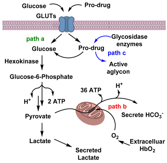 Glucose metabolism and prodrug route inside the cells: Glucose or glyco-conjugated pro drugs get internalized inside the cells via glucose transporters (GLUTs). Glucose metabolism follows either path a—anaerobic glycosylation; path b—aerobic glycosylation; or path c—cleavage of the active drug by a glycosydic enzyme.