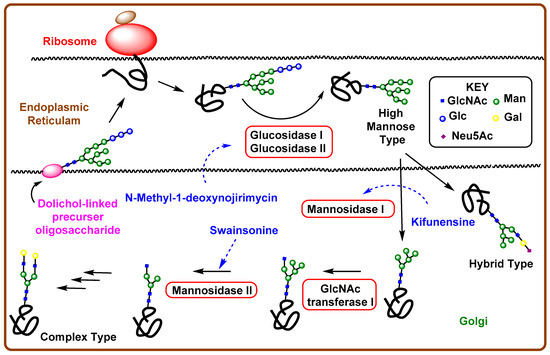 Cell glycans are synthesized by many glycosyltransferases, and the process generally occurs in the endoplasmic reticulum or Golgi apparatus [70,71]. For example, some enzymes are responsible for the aberrant addition or truncation of the carbohydrate moieties on cell surface lipids, proteins, or peptides, which also play roles in distinguishing tumor cells from normal cells and tumor metastasis [72]. Similar to mutations in genes, due to aberrant O-glycosylation, N-linked oligosaccharides also play a critical role in tumor cell progression and mitosis. The biosynthesis of N-glycoproteins, that normally begins in the endoplasmic reticulum (ER), involves three major sequences. The first phase involves the synthesis of a dolichol-linked precursor oligosaccharide, GLc3Man9GlcNAc2-PP-Dol. The lipid molecule, dolichol, is found to be attached to the membrane of ER and contains one phosphate group to add various sugar molecules (two GlcNAc, nine mannose, and three glucose), with a pyrophosphate group. After synthesis of the precursor molecule, it gets transferred to an asparagine (Asn) residue of a protein by oligosaccharyltransferases. The final phase involves modification of the oligosaccharide chain by several trimming reactions, such as the stepwise removal of three glucose molecules and up to six mannose residues by glucosidase I and II. Following the attack by enzymes, the remaining central core undergoes further processing reactions, e.g., the addition of other sugars, such as N-acetylglucosamine, galactose, neuraminic acid, L-fucose, and N-acetylgalactoseamine performed by several glycotransferase enzymes to produce three different types of N-glycans (Figure 5). High mannose-type glycans contain additional mannose units, whereas both hybrid and complex types contain additional monosaccharide units attached to the core. Due to the complex nature of those aglycons, any variation in this biosynthesis may lead to oncogenesis and tumor metastasis. Therefore, the identification of new therapeutic strategies for the inhibition of those glycosidases has captured the attention of scientists to prevent aberrant N-glycosylation and, hence, halt cancer.
