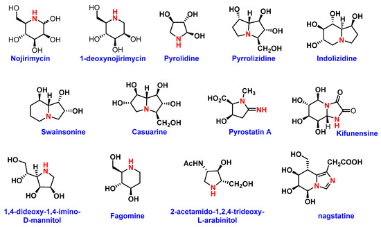 Several naturally-occurring iminosugars have noted anticancer activity through their ability to target the N-glycan biosynthesis pathway. These azo sugars are carbohydrate analogs, in which the oxygen heteroatom position in the ring is replaced by a more basic trivalent nitrogen. This simple substitution makes synthesis challenging and generates opportunities for evaluation of biological activities. The most common naturally occurring rings for this class are pyrrolidine, piperidine, pyrrolizidine, indolizidine, and nor-tropane (Figure 6). Since the first isolation of nojirimycin from Streptomyces roseochromogenes R-468, as an antibiotic, approximately 200 naturally occurring azo sugars have been isolated, but still very few are available for pharmaceutical applications [73]. The initial biological evaluations of these sugar analogs indicate their glycosidase and glycosyltransferase inhibitory properties [73]. Recently, these analogs have gained importance in the development of new anticancer drugs. Most of the investigations were, however, carried out on plant glycosidases. Hence, further work is required on mammalian glycosidases to uncover their potential in cancer research.