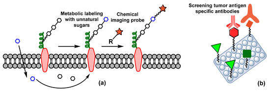 Some serum glycoprotein biomarkers, such as carcino-embryonic antigen (CEA), carbohydrate antigens 19-9 (CA19-9) and 125 (CA125), alpha-fetoprotein (AFP), and prostate-specific antigen (PSA) have been found to be useful in the initial detection of colon, ovarian, and prostate cancers [79]. Alternatively, early detection is possible in positron emission tomography (PET), based on an increased concentration of 2-flurodeoxy-D-glucose (18FDG) in tumor cells. As cancer cells are more metabolically active, another imaging probe strategy, named metabolic oligosaccharide engineering (MOE) technology, has recently opened a new era in cancer diagnosis. In this strategy, non-natural derivatives of sialic acid, GalNAc, and fucose are supplied exogenously and get incorporated, using biosynthetic machinery, within the cellular glycans chains (Figure 7a). Those glycans get tagged with chemical imaging probes using biorthogonal reactions, and then are monitored with magnetic resonance imaging (MRI) [80].