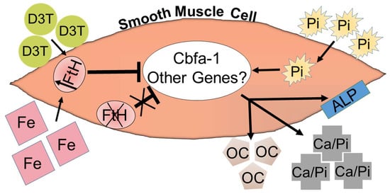 The potential hazardous effects of excessive iron cations are well recognized, and their optimal dosage and utilization frequency in CKD patients have been a major point of debate among nephrologists [121,122,123]. Accordingly, based on the aforementioned evidence, we sought to identify other approaches to upregulate FtH expression in VSMC without using excessive iron and examine how the pharmacological induction of ferritin may affect VC. To achieve this objective, we tested the effects of 3H-1,2-Dithiole-3-thione (D3T), a well-known cancer chemopreventive agent [124] and inducer of FtH expression [125], in a model of VSMC calcification. It was demonstrated that D3T inhibited osteoblastic transition of VSMC in a dose-dependent manner [126]. However, the central role of ferritin was further corroborated in experiments where the inhibitory effects of D3T on osteoblastic transition were arrested during FtH knockdown by RNA interference [126]. The overall effect of iron/D3T-induced FtH upregulation and inhibition of VSMC calcification is illustrated in Figure 1.