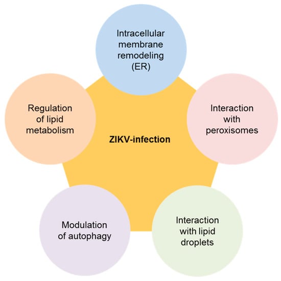 Multiple connections of the Zika virus (ZIKV) with lipid metabolism. The varied interactions of ZIKV with metabolic networks and lipid metabolism-related cellular structures are indicated. See the text for details.