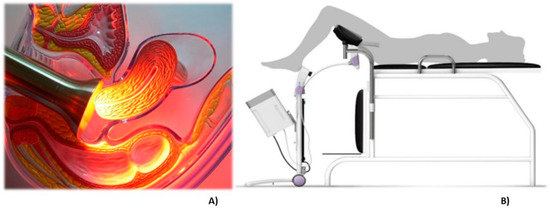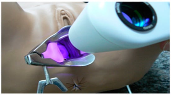The probe for PDT irradiation contains LEDs emitting at 630 nm, a wavelength indicated for PpIX activation. An acrylic tube is used to guarantee the homogenous light distribution and a stainless steel instrument that can be autoclaved. The procedure is comfortable for the patients and during the total time of illumination, they did not report any discomfort or pain. In some cases, a mild colic was reported. In Figure 4A, there is an illustration of the irradiation probe in direct contact with the cervix and at panel B, a drawing of the clinical setup is shown.