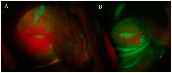 Cervix images of a patient with CIN 1 obtained with CerCa 150 Systems® coupled with Sony Xperia®. Panel A: protoporphyrin IX (PpIX) fluorescence in the cervix and Panel B: cervix fluorescence after PDT (LED 630 nm, 80 mw/cm2, with a total dose of 100 J/cm2).