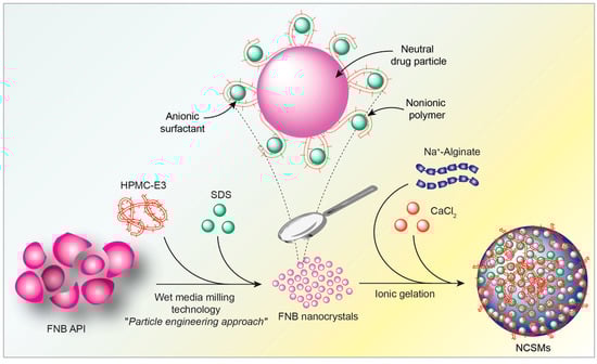 To this end, we developed nanocrystals in composite spherical microparticles (NCSMs) encapsulated with FNB-NCs with pH sensitivity to respond to GI tract environmental pH changes for enhanced oral drug delivery. First, highly stable aqueous FNB-NCs in a stable suspension form were created using previously established protocols for wet stirred media milling (WSMM) [17,20,21,22,23,24]. These FNB-NCs were then directly used for the development of NCSMs using an ionotropic crosslinking technique to prevent rapid gastric disintegration and site-specific release of FNB in the small intestine. An overview of NCSM production is illustrated in Figure 1. That was followed by a comprehensive characterization of the NCSMs, which included X-ray powder diffraction (XRD), thermal analysis (thermogravimetric analysis (TGA) and differential scanning calorimetry (DSC)), and attenuated total reflection Fourier-transform infrared spectroscopy (ATR-FTIR). NCSM morphology was tested using SEM, and in vitro FNB release investigations were done with an automated USP-II dissolution apparatus. Furthermore, the in situ dissolution behavior of NCSMs was characterized by a UV-based surface dissolution imager (SDI) that qualitatively recorded the dissolved drug concentration gradient in real time, depicted as color maps. Through such a multifaceted assessment, we evaluated the efficacy of NCSMs containing FNB-NCs for use as a solid dosage form for oral delivery in site-specific drug delivery applications.