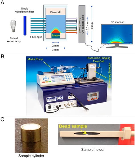 Graphical representation of the working principle of (A) surface dissolution imager (SDI) technology, (B) the instrument, and (C) sample preparation procedure.