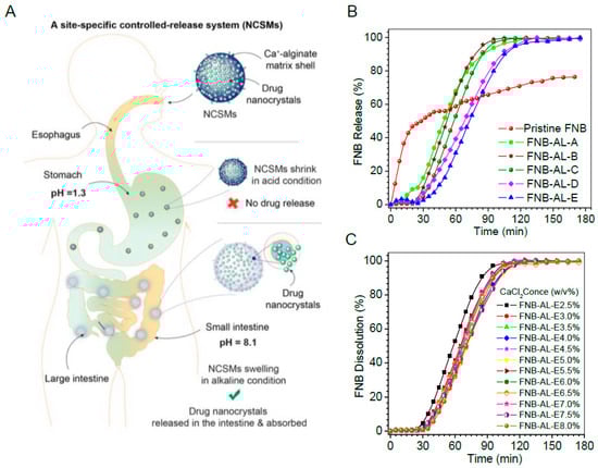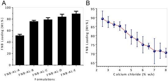 Site-specific release of FNB-NCs was obtained by creating NCSMs. We used a simple ionotropic crosslinking technique for the stable and highly effective release of the drug in intestinal pH. The crosslinking reaction between the calcium ions and AL polymeric chains in the aqueous media was responsible for the formation of solid microparticles of the calcium–AL “egg-box” structure [9,19,27,28] with effective encapsulation of FNB-NCs by the gelling process. About 51.34–89.32 wt % of FNB-NCs was encapsulated in NCSMs, depending upon the concentration of the FNB-NC suspensions and crosslinker concentrations (Figure 3A). Furthermore, the FNB-NC loading in NCSMs was highly dependent on the crosslinker concentrations. As the initial concentration of calcium chloride was set at 2.5% (w/v), the amount of FNB-NCs encapsulated in NCSMs was higher and subsequently decreased with higher crosslinker concentrations due to the tight binding of calcium ions with AL polymeric chains (Figure 3B). This is explained by the valency of the binding site in AL polymeric chains that was completely satisfied by calcium ions and the formation of a tight junction between AL polymeric chains making it unavailable for FNB-NCs. It could also be seen visually that semitransparent AL placebo spherical particles were acquired after crosslinking with calcium ions, while off-white NCSMs were obtained due to FNB-NCs in the microparticles. To attain maximum encapsulation of FNB-NCs in NCSMs, the AL:NS ratio was set to 1:16.93 (w/w) and calcium chloride concentration was set to 2.5% (w/v) in the subsequent experiments and further considered for final formulations.
