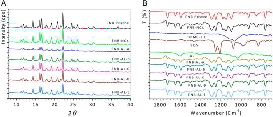The solid state of pristine FNB, FNB-NCs, and NCSMs was investigated using XRD, ATR-FTIR, TGA, and DSC techniques. To better investigate these multicomponent formulations, placebo AL spherical particles without FNB-NCs were prepared and used as a reference in this study.