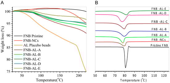 Thermal analyses of the pristine FNB, FNB-NCs, and NCSMs are shown in Figure 5A. TGA patterns of AL placebo spherical particles showed a characteristic first-order transition at ~80 °C corresponding to a melting endothermic peak (DSC data) and ~203 °C due to complete decomposition of the AL chain network with calcium ions. The TGA curve of pristine FNB showed single-step weight loss at temperatures of ~200 to 248 °C. This strong endothermic peak was indicative degradation of FNB. The endothermic weight loss peaks of FNB-NCs were shown in three steps at 65, 125, and 246 °C. The first weight loss peak corresponded to the HPMC-E3 melting point (DSC data). This indicated the formation of an HPMC-E3-SDS complex that was present on the surface of the drug particles. From the curves of NCSM weight loss data, it was clearly seen that a marked endothermic weight loss occurred in two distinctive steps at 80–85 and 240–250 °C. This step was directly correlated with AL placebo spherical particles and FNB-NCs. The residual moisture in all formulations are reported in Table 1. All the formulations had a residual of moisture content less than 3.0%, as measured by weight loss in TGA. Apparently, most of the water in the suspensions was removed during the drying process.