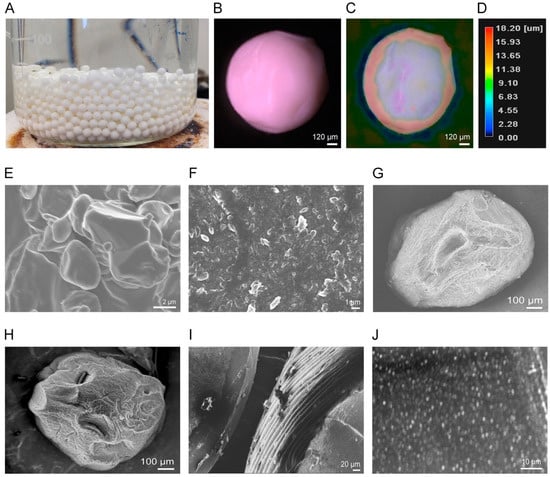 Production of NCSMs via a simple ionotropic crosslinking technique and characterization of the surface morphology. (A) Photographic image of microparticles after curing of NCSMs in crosslinker solution. (B) Optical microscope image of NCSMs with (C) height measurements and (D) color code bar. SEM images of (E) pristine FNB particles, (F) FNB-NCs, (G) placebo AL microparticle, (H) FNB-NC-encapsulated NCSMs (FNB-AL-E), (I) cross section of NCSMs with uniform surface wrinkling patterns, and (J) high-resolution cross section of uniformly distributed FNB-NCs in NCSMs.
